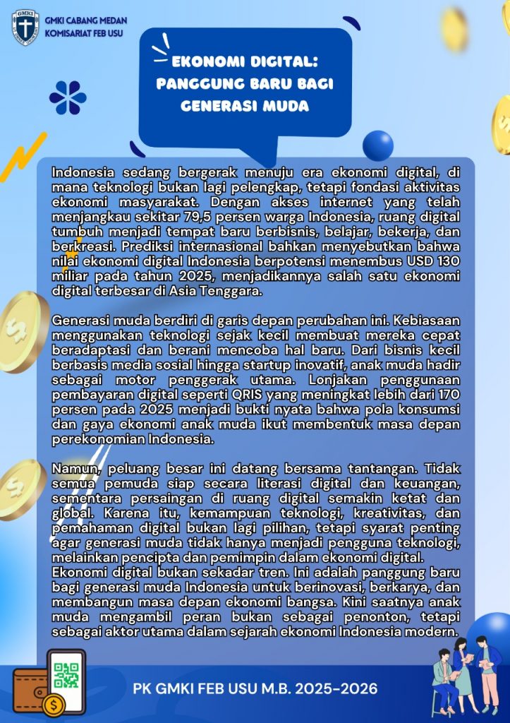 Namun, peluang besar ini datang bersama tantangan. Tidak semua pemuda siap secara literasi digital dan keuangan, sementara persaingan di ruang digital semakin ketat dan global. Karena itu, kemampuan teknologi, kreativitas, dan pemahaman digital bukan lagi pilihan, tetapi syarat penting agar generasi muda tidak hanya menjadi pengguna teknologi, melainkan pencipta dan pemimpin dalam ekonomi digital. Ekonomi digital bukan sekadar tren. Ini adalah panggung baru bagi generasi muda Indonesia untuk berinovasi, berkarya, dan membangun masa depan ekonomi bangsa. Kini saatnya anak muda mengambil peran bukan sebagai penonton, tetapi sebagai aktor utama dalam sejarah ekonomi Indonesia modern.