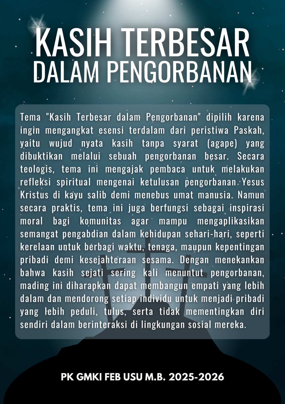 Tema “Kasih Terbesar dalam Pengorbanan” dipilih karena ingin mengangkat esensi terdalam dari peristiwa Paskah, yaitu wujud nyata kasih tanpa syarat (agape) yang dibuktikan melalui sebuah pengorbanan besar. Secara teologis, tema ini mengajak pembaca untuk melakukan refleksi spiritual mengenai ketulusan pengorbanan Yesus Kristus di kayu salib demi menebus umat manusia. Namun secara praktis, tema ini juga berfungsi sebagai inspirasi moral bagi komunitas agar mampu mengaplikasikan semangat pengabdian dalam kehidupan sehari-hari, seperti kerelaan untuk berbagi waktu, tenaga, maupun kepentingan pribadi demi kesejahteraan sesama. Dengan menekankan bahwa kasih sejati sering kali menuntut pengorbanan, mading ini diharapkan dapat membangun empati yang lebih dalam dan mendorong setiap individu untuk menjadi pribadi yang lebih peduli, tulus, serta tidak mementingkan diri sendiri dalam berinteraksi di lingkungan sosial mereka.