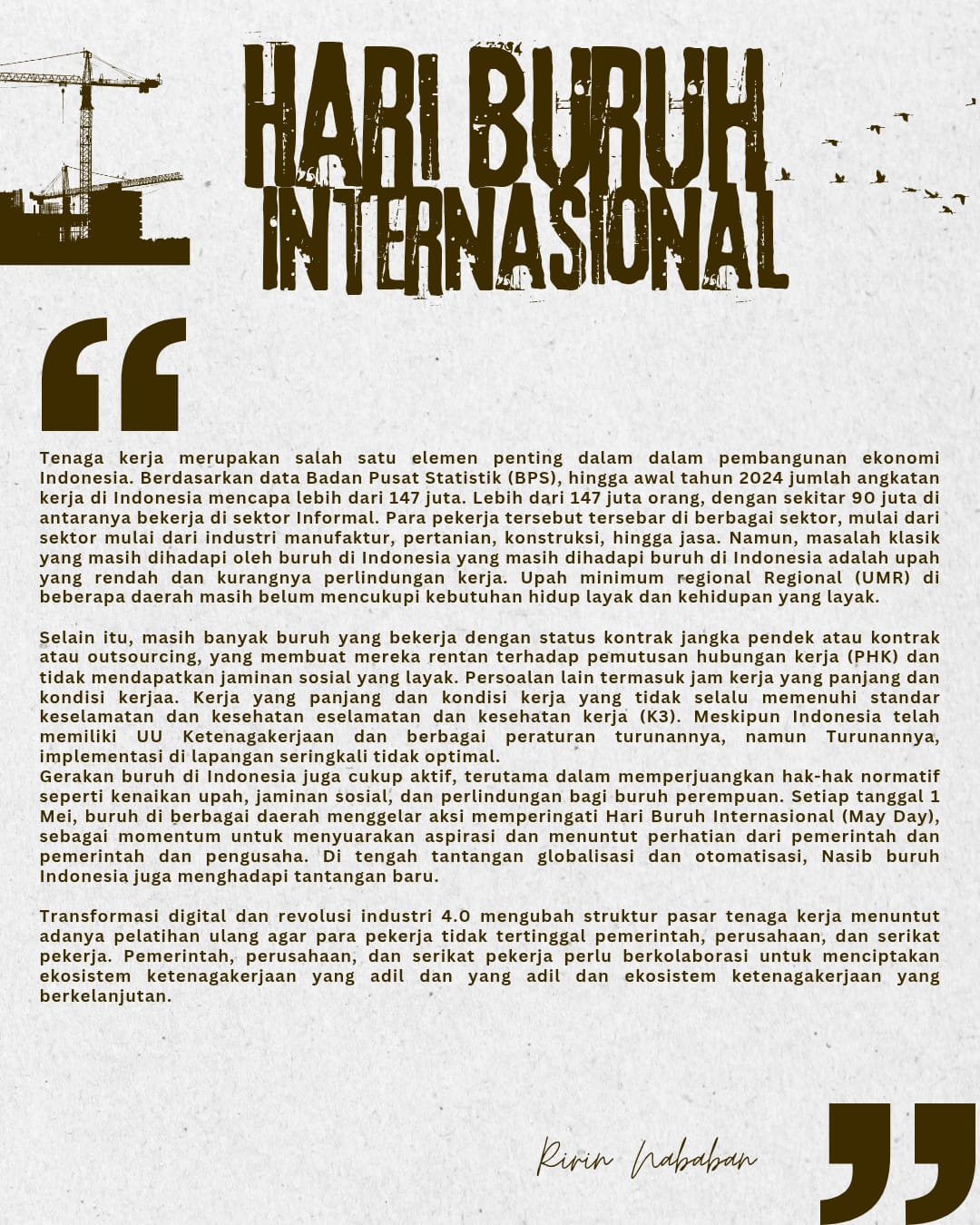 Tenaga kerja merupakan salah satu elemen penting dalam dalam pembangunan ekonomi Indonesia. Berdasarkan data Badan Pusat Statistik (BPS), hingga awal tahun 2024 jumlah angkatan kerja di Indonesia mencapai lebih dari 147 juta. Lebih dari 147 juta orang, dengan sekitar 90 juta di antaranya bekerja di sektor Informal. Para pekerja tersebut tersebar di berbagai sektor, mulai dari sektor mulai dari industri manufaktur, pertanian, konstruksi, hingga jasa. Namun, masalah klasik yang masih dihadapi oleh buruh di Indonesia yang masih dihadapi buruh di Indonesia adalah upah yang rendah dan kurangnya perlindungan kerja. Upah minimum regional Regional (UMR) di beberapa daerah masih belum mencukupi kebutuhan hidup layak dan kehidupan yang layak.