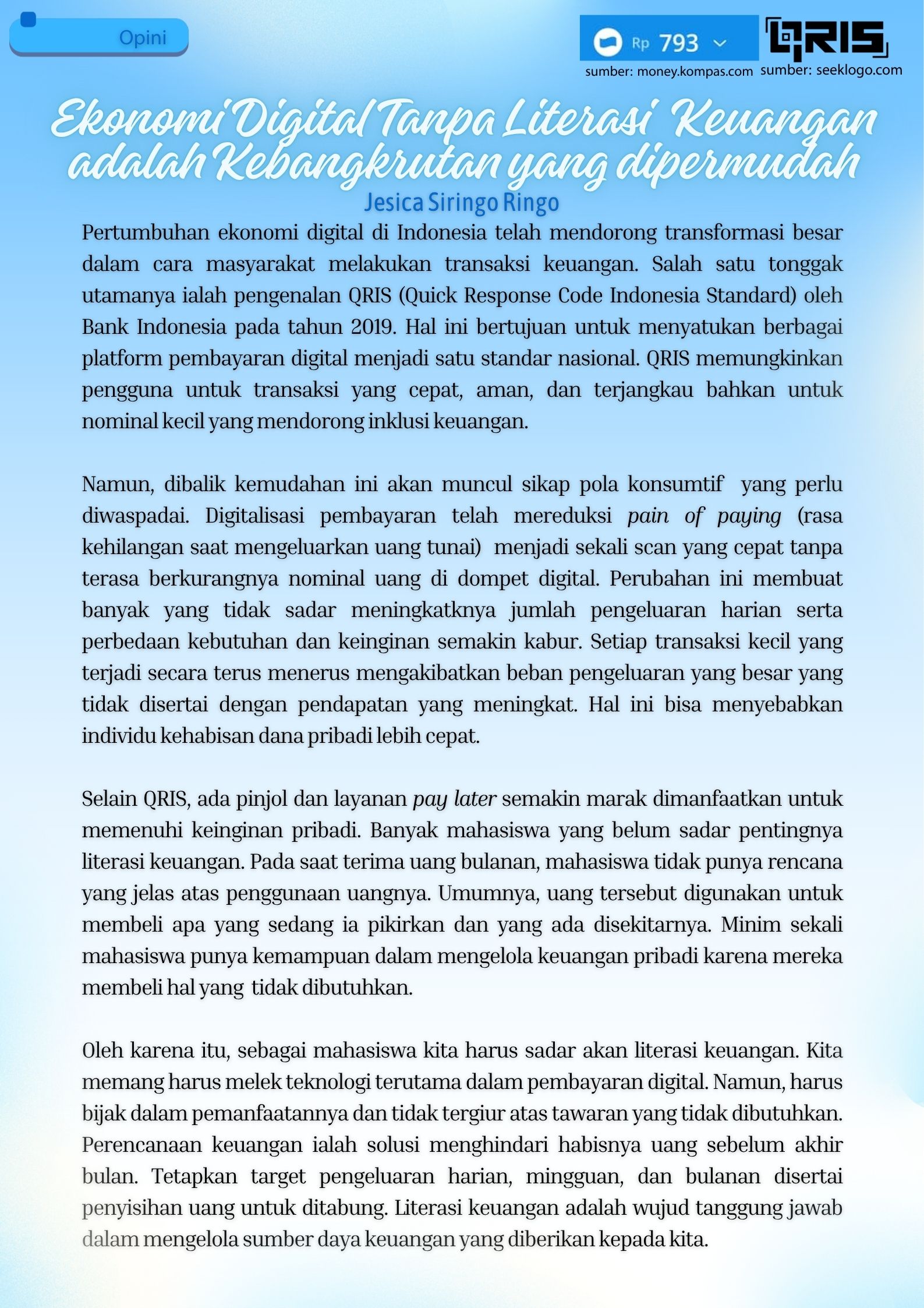 Oleh karena itu, sebagai mahasiswa kita harus sadar akan literasi keuangan. Kita memang harus melek teknologi terutama dalam pembayaran digital. Namun, harus bijak dalam pemanfaatannya dan tidak tergiur atas tawaran yang tidak dibutuhkan. Perencanaan keuangan ialah solusi menghindari habisnya uang sebelum akhir bulan. Tetapkan target pengeluaran harian, mingguan, dan bulanan disertai penyisihan uang untuk ditabung. Literasi keuangan adalah wujud tanggung jawab dalam mengelola sumber daya keuangan yang diberikan kepada kita.