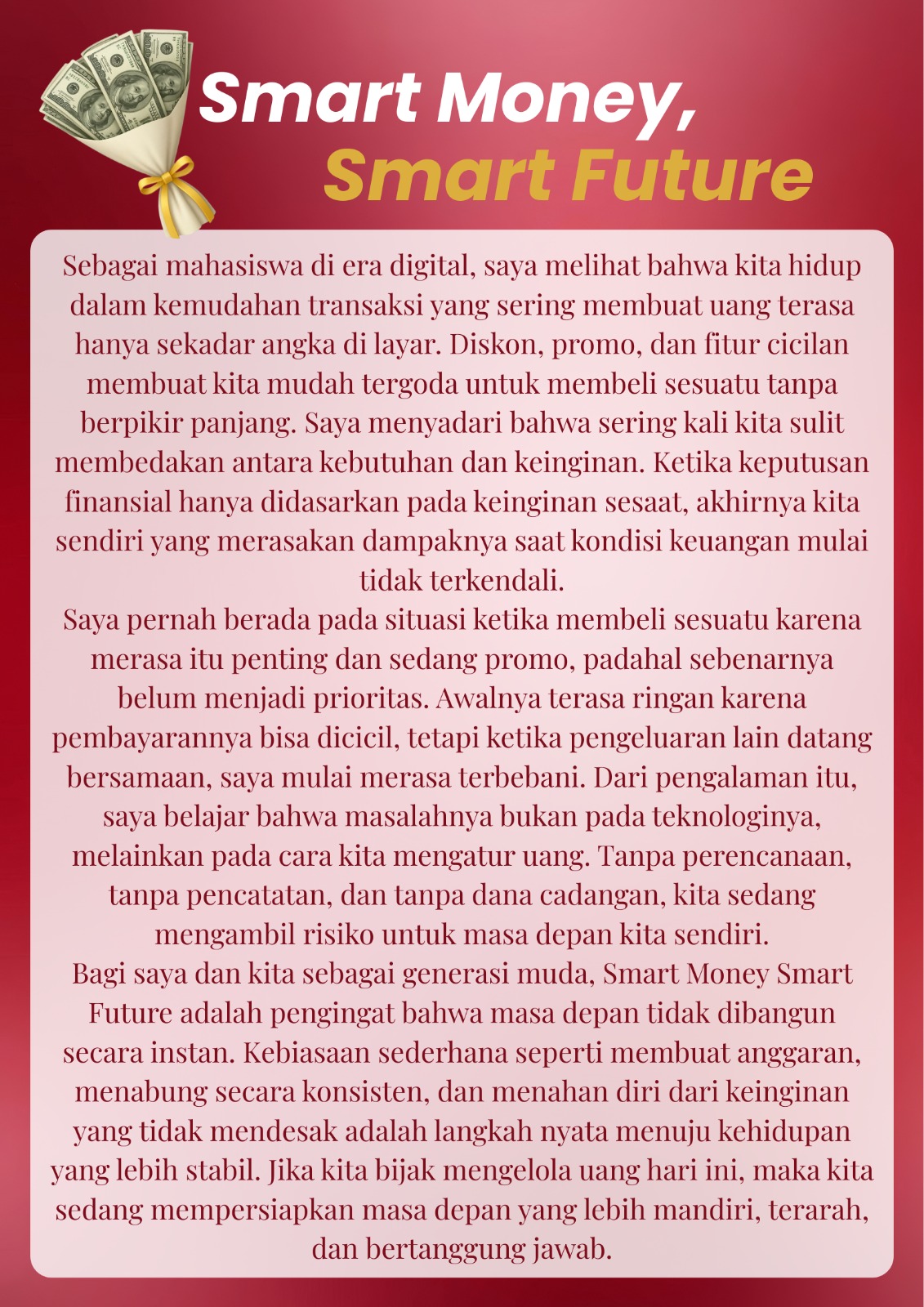 Bagi saya dan kita sebagai generasi muda, Smart Money Smart Future adalah pengingat bahwa masa depan tidak dibangun secara instan. Kebiasaan sederhana seperti membuat anggaran, menabung secara konsisten, dan menahan diri dari keinginan yang tidak mendesak adalah langkah nyata menuju kehidupan yang lebih stabil. Jika kita bijak mengelola uang hari ini, maka kita sedang mempersiapkan masa depan yang lebih mandiri, terarah, dan bertanggung jawab.