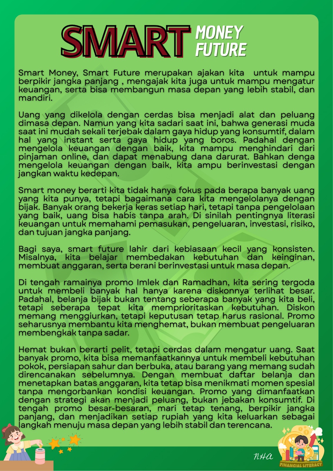 Smart Money, Smart Future merupakan ajakan kita untuk mampu berpikir jangka panjang, mengajak kita juga untuk mampu mengatur keuangan, serta bisa membangun masa depan yang lebih stabil, dan mandiri.