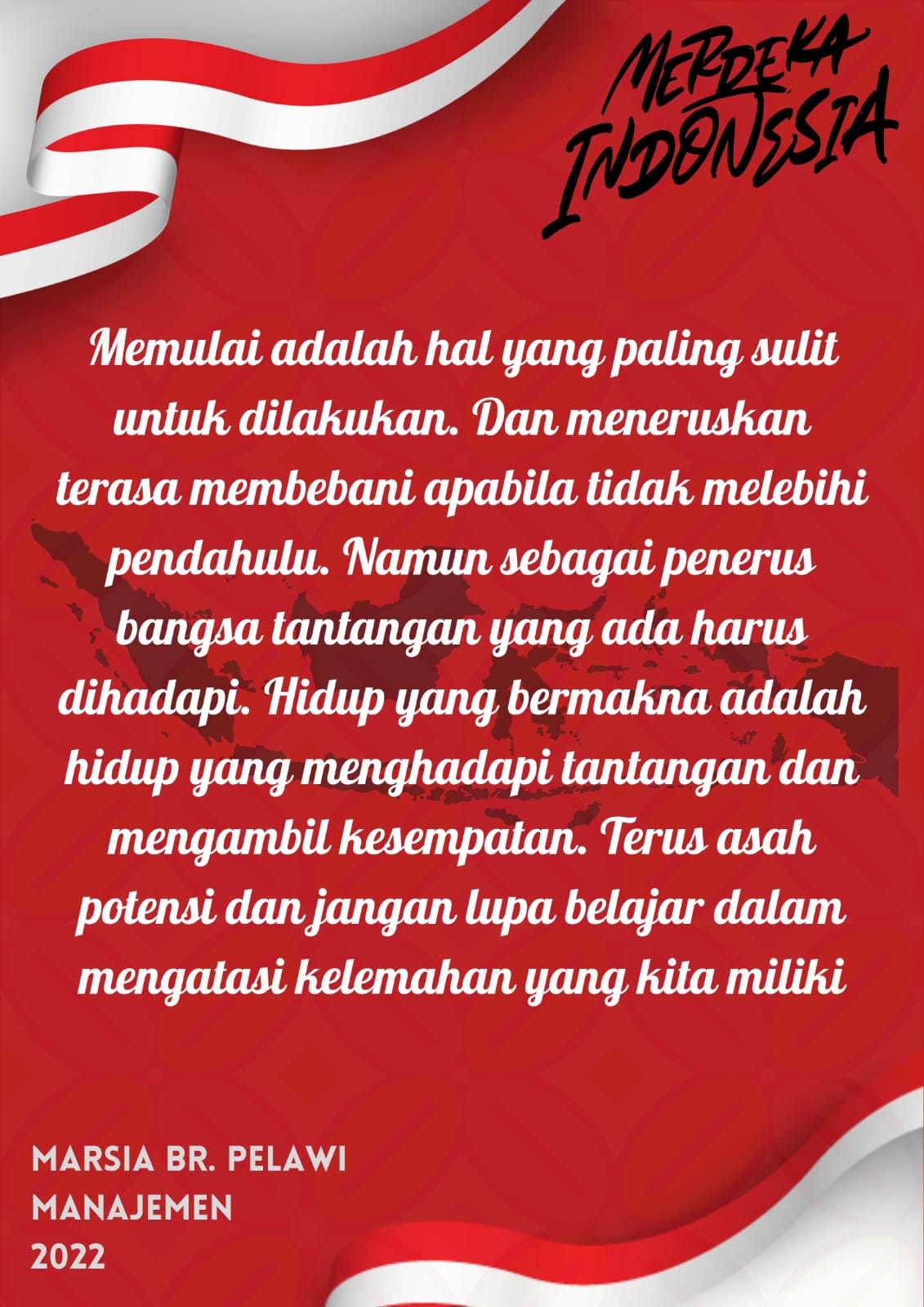 Memulai adalah hal yang paling sulit untuk dilakukan. Dan meneruskan terasa membebani apabila tidak melebihi pendahulu. Namun sebagai penerus bangsa tantangan yang ada harus dihadapi. Hidup yang bermakna adalah hidup yang menghadapi tantangan dan mengambil kesempatan. Terus asah potensi dan jangan lupa belajar dalam mengatasi kelemahan yang kita miliki.