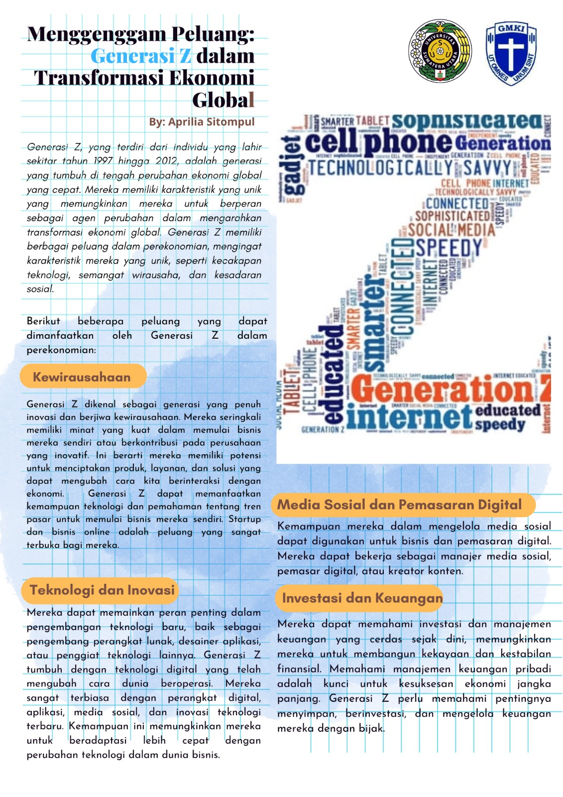 Generasi Z. yang terdiri dari individu yang lahir sekitar tahun 1997 hingga 2012, adalah generasi yang tumbuh di tengah perubahan ekonomi global yang cepat. Mereka memiliki karakteristik yang unik yang memungkinkan mereka untuk berperan sebagai agen perubahan dalam mengarahkan transformasi ekonomi global. Generasi Z memiliki berbagai peluang dalam perekonomian, mengingat karakteristik mereka yang unik, seperti kecakapan teknologi, semangat wirausaha, dan kesadaran sosial.