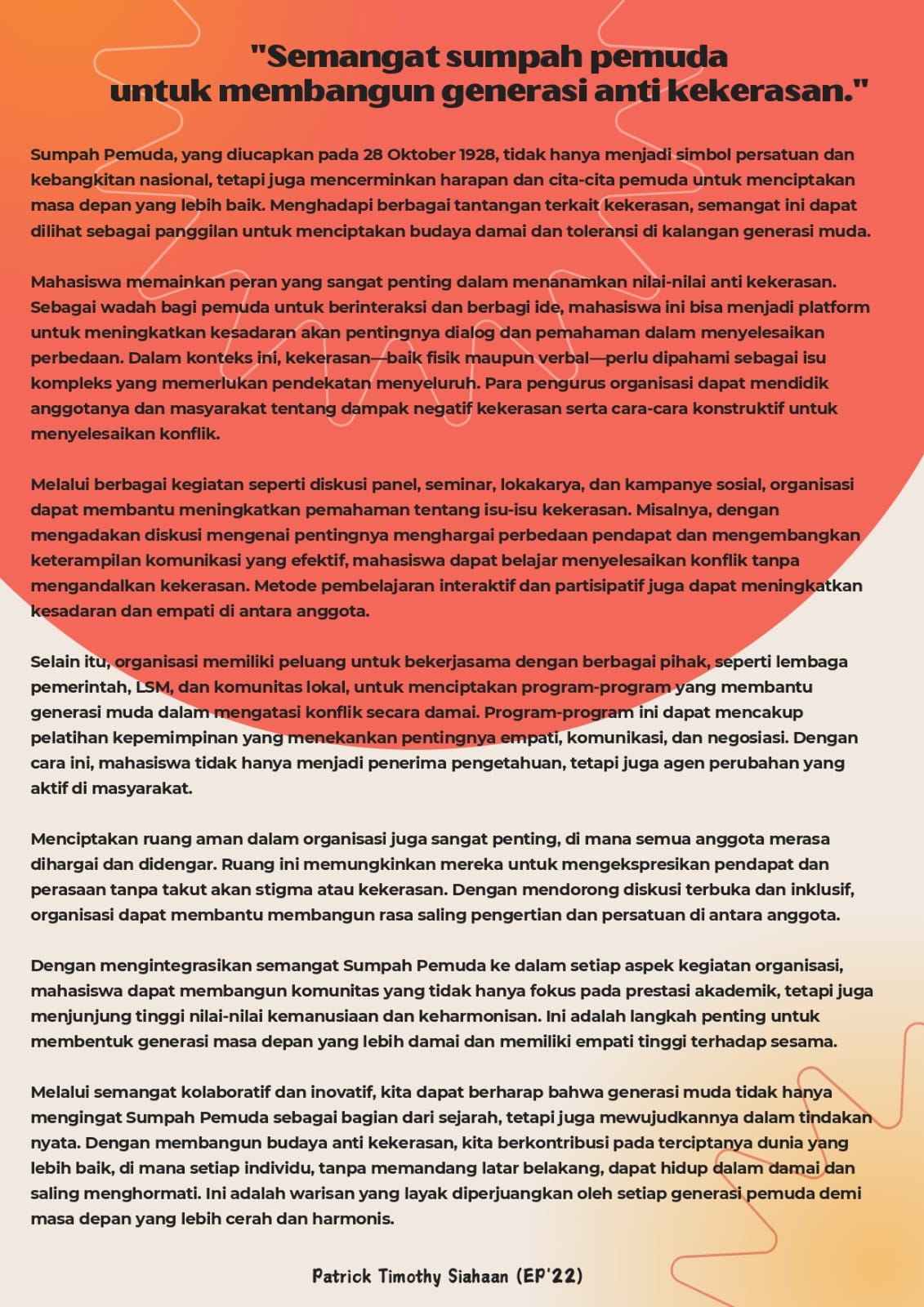 Mahasiswa memainkan peran yang sangat penting dalam menanamkan nilai-nilai anti kekerasan. Sebagai wadah bagi pemuda untuk berinteraksi dan berbagi ide, mahasiswa ini bisa menjadi platform untuk meningkatkan kesadaran akan pentingnya dialog dan pemahaman dalam menyelesaikan perbedaan. Dalam konteks ini, kekerasan-baik fisik maupun verbal-perlu dipahami sebagai isu kompleks yang memerlukan pendekatan menyeluruh. Para pengurus organisasi dapat mendidik anggotanya dan masyarakat tentang dampak negatif kekerasan serta cara-cara konstruktif untuk menyelesaikan konflik.
