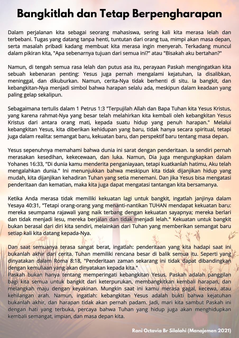 Paskah bukan hanya tentang memperingati kebangkitan Yesus. Paskah adalah panggilan bagi kita semua untuk bangkit dari keterpurukan, membangkitkan kembali harapan, dan melangkah maju dengan keyakinan. Mungkin saat ini kamu merasa gagal, kecewa, atau kehilangan arah. Namun, ingatlah: kebangkitan Yesus adalah bukti bahwa kejatuhan bukanlah akhir, dan harapan tidak akan pernah padam. Jadi, mari kita sambut Paskah ini dengan hati yang terbuka, percaya bahwa Tuhan yang hidup juga akan menghidupkan kembali semangat, impian, dan masa depan kita.